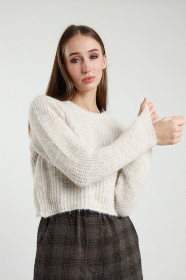 Rundhalspullover mit englischem Rippmuster. 50 % Stück, 30 % Stück, 10 % Stoff, 10 % Stoff