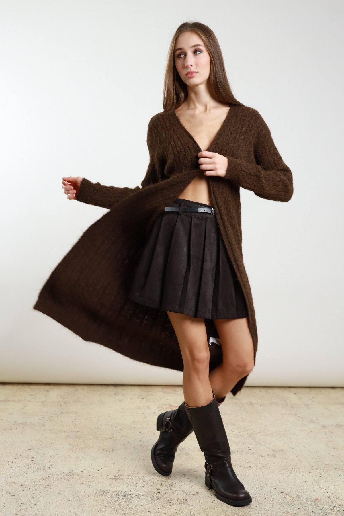 Lange Strickjacke mit Zöpfen, ohne Verschluss. 50 % Stück, 30 % Stück, 10 % Stoff, 10 % Stoff
