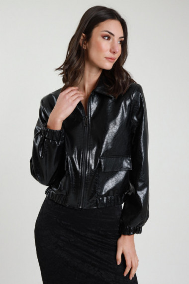 Eco -Lederjacke mit Rändern, klassischen Reverse, Knöpfen und Vordertaschen. 51%PL 49%PU