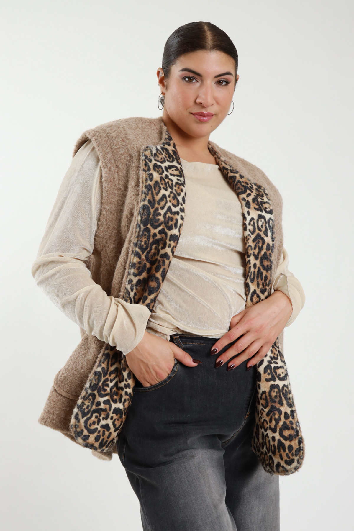 Ärmellose Weste aus gekochter Wolle mit Vordertaschen und Animalier-Punktmuster auf der Innenseite – Curvy Susy Star Line.  100%pl
