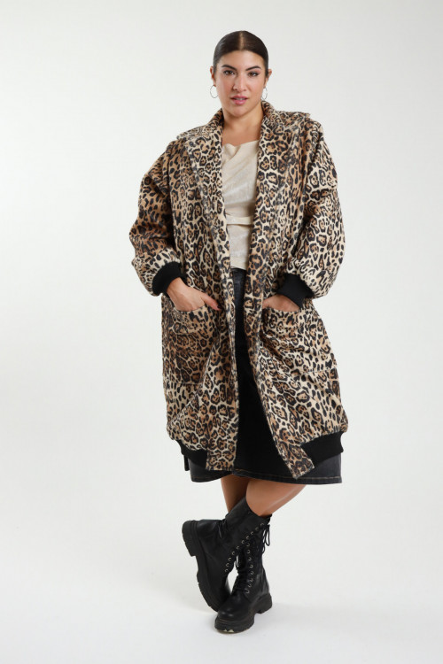 Long Furry Effect Spotted Bomber Jacket with Front Pockets - Curvy Susy Star line. 98%co 2%ea