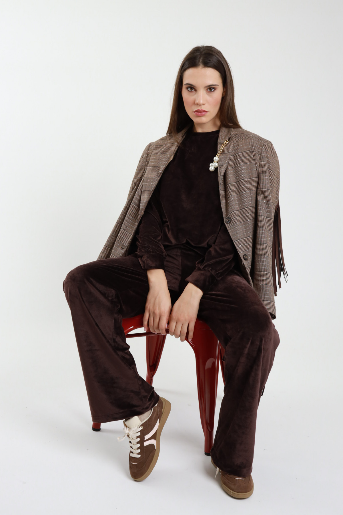 Einreihiger Blazer mit Karomuster und Mikropailletten mit Fransen am Rücken und an den Ärmeln, abnehmbarem Perlendetail. 65 %pl 33 %vi 2 %ea