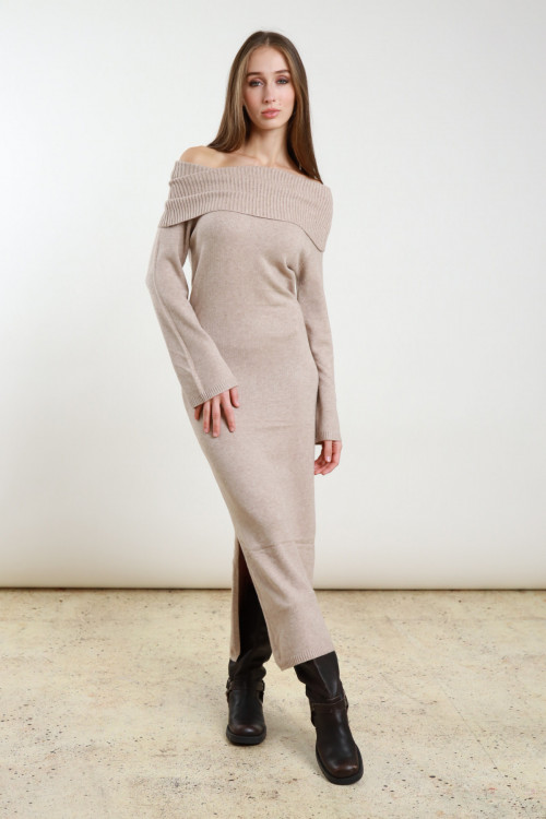 Langes Kleid mit Shiffer-Ausschnitt und Seitenschlitzen. 63%vi 37%ny