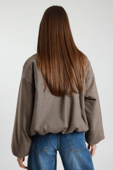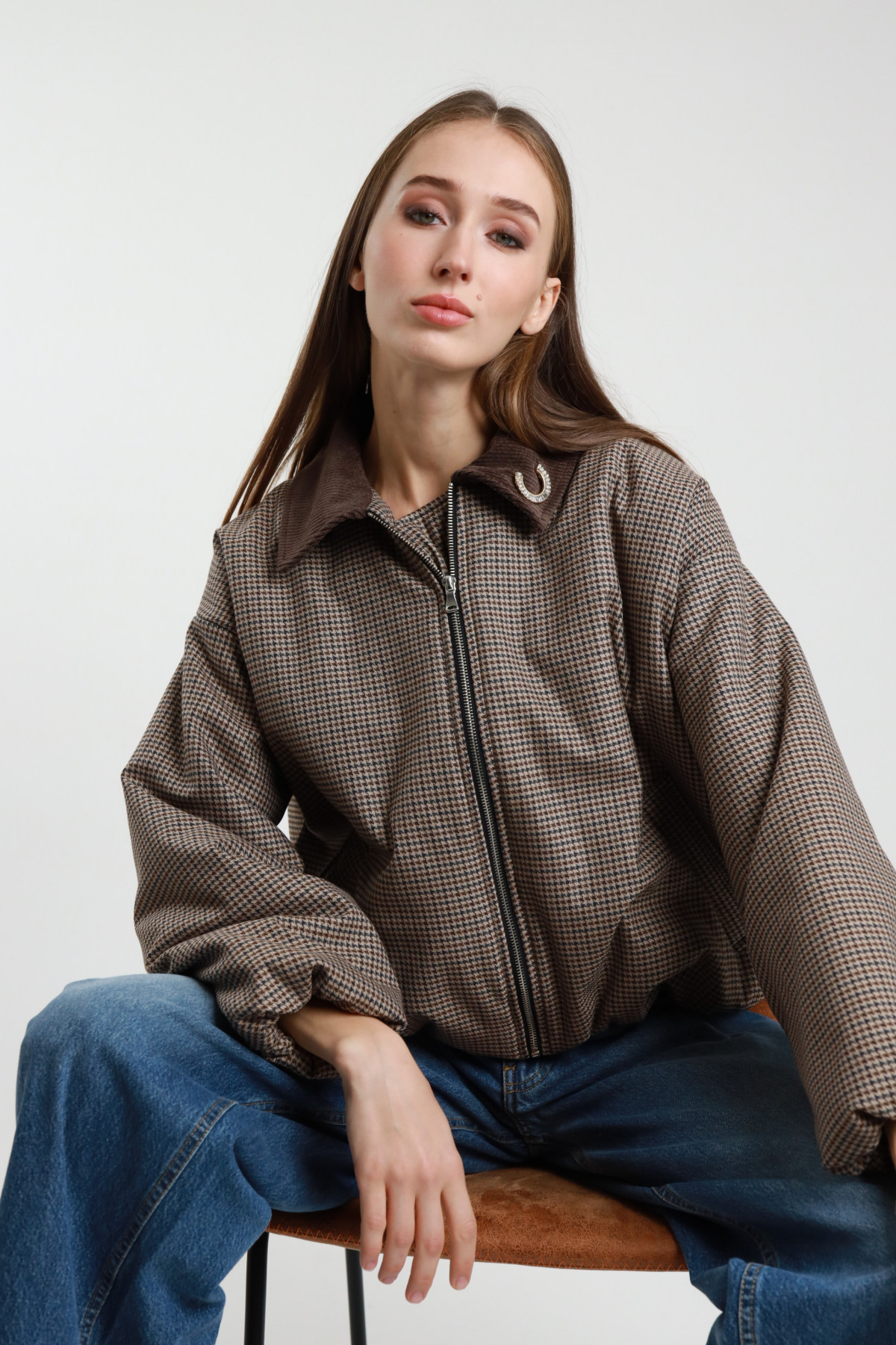 Karierte Bomberjacke mit Reißverschluss und Brosche am Kragen. 63%pl 34%vi 3%ea+100%pl