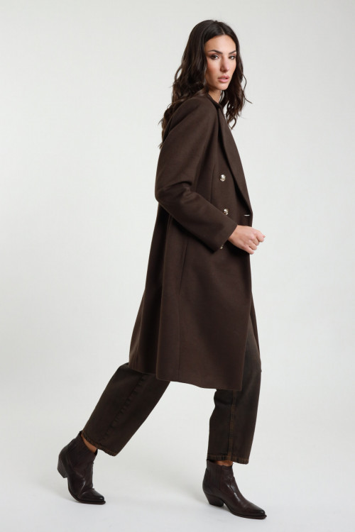 Cappotto Lungo Doppiopetto con Cintura Maculata e Spilla Applicata sul Rever. Tasche Frontali a Filetto e Spacco sul Retro.