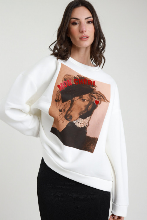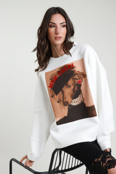Felpa Girocollo con Applicazione Coniglio con Strass e Scritte.