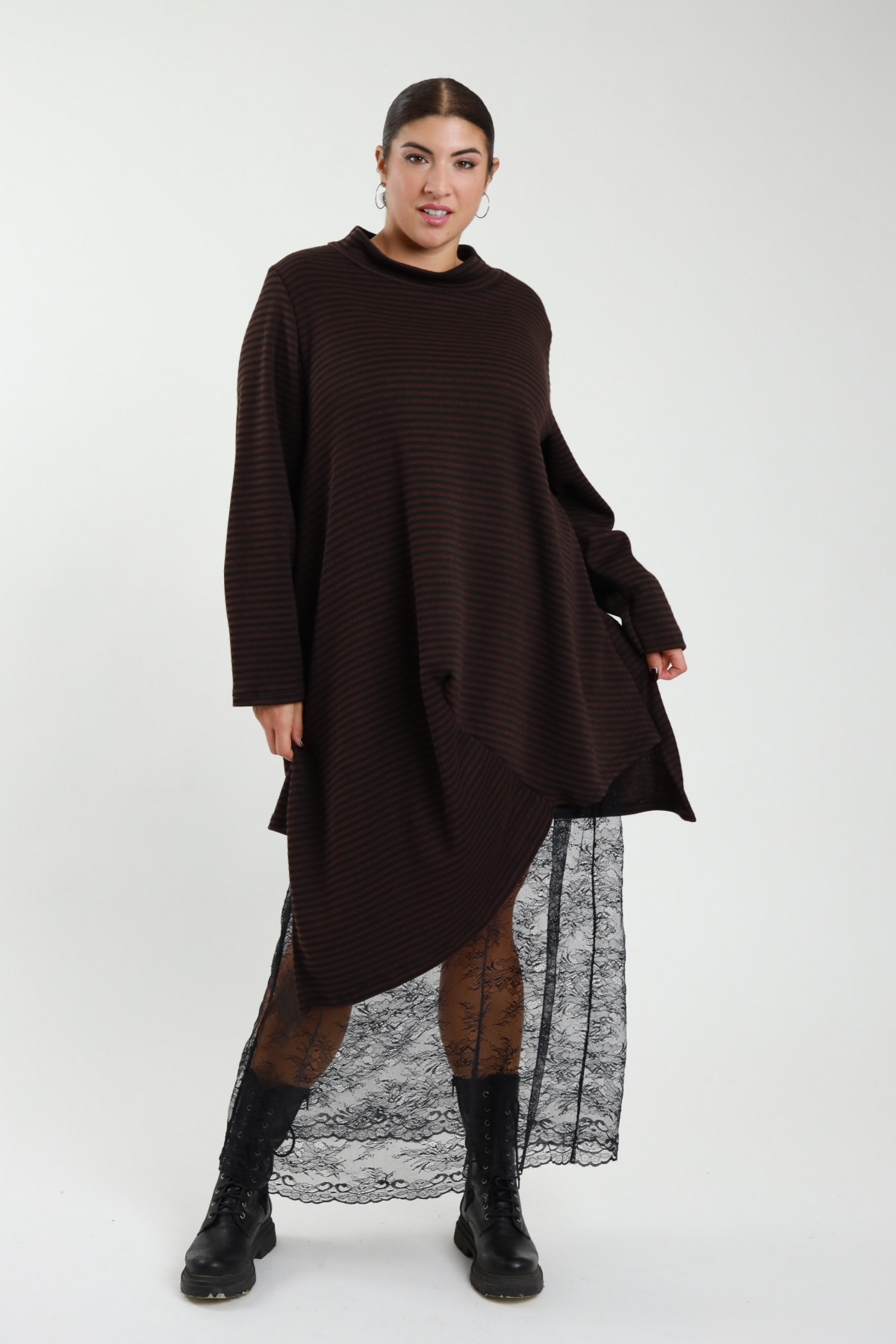 Asymmetrisch gestreifter Maxipullover mit Spitzenrock – Curvy Susy Star-Linie. 45 % vi 33 % pl 22 % pa + 100 % vi + 100 % pa