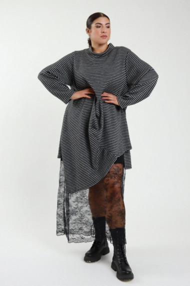 Asymmetrisch gestreifter Maxipullover mit Spitzenrock – Curvy Susy Star-Linie. 45 % vi 33 % pl 22 % pa + 100 % vi + 100 % pa