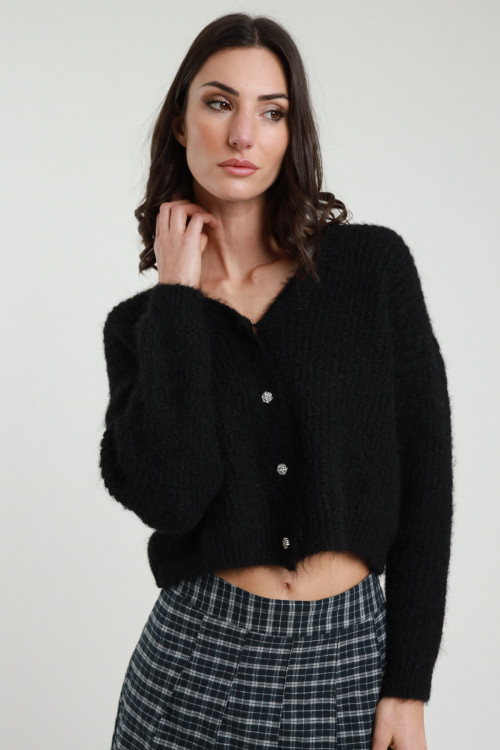 Cardigan Crop Scollo V, Chiusura 5 bottoni, Orli a Costine.
