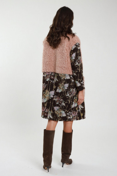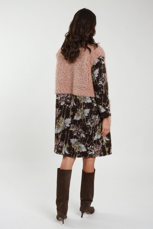 Langer gemusterter Mantel mit Kunstpelzeinsätzen und aufgesetzten Taschen vorne. Kragen und Knopfverschluss. 50%pl 50%co+100%pl+100%pl