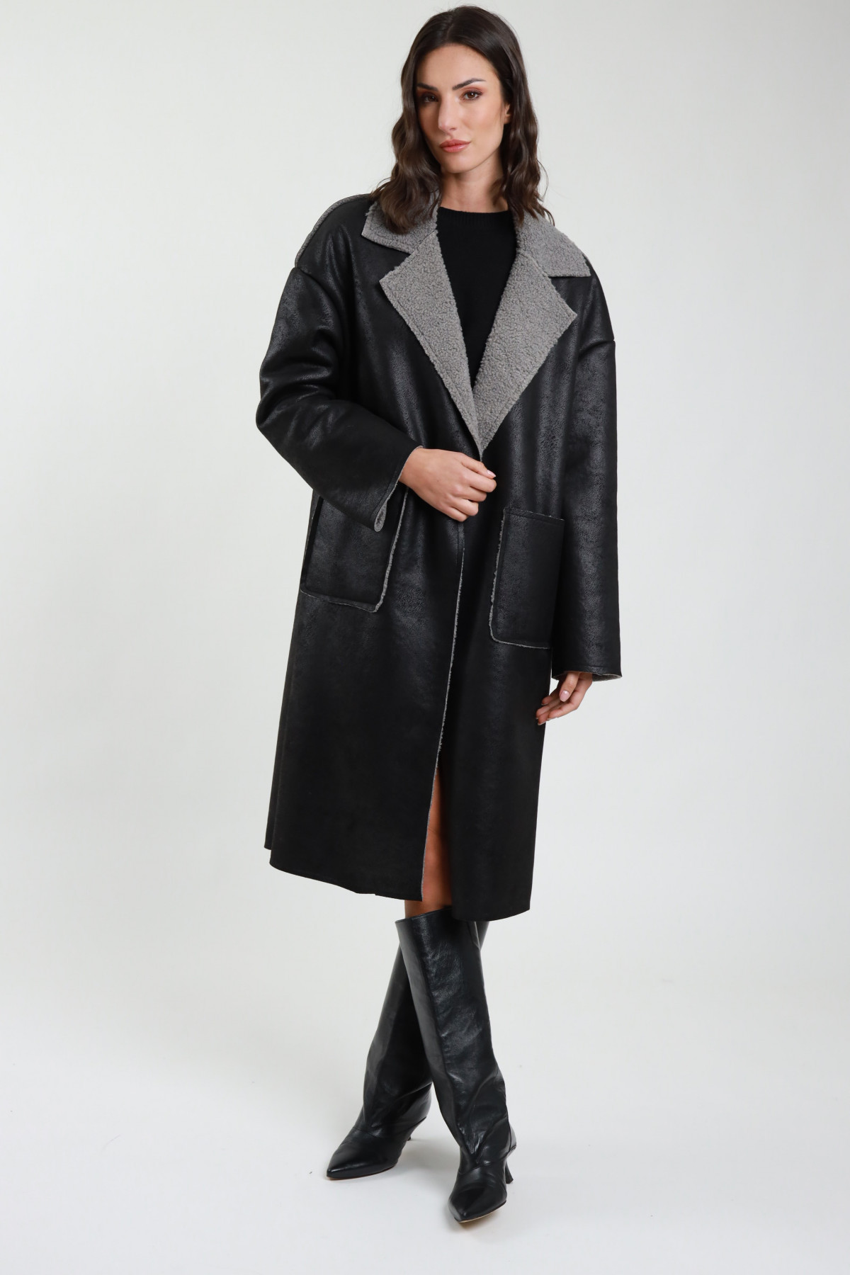 Cappotto Lungo in Ecopelliccia con Tasche Laterali, Senza Chiusura.
