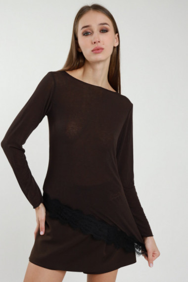 Langärmliges T-Shirt mit U-Boot-Ausschnitt und Spitze am Saum. 80 %vi 9 %pa 6 %ea 5 %ws