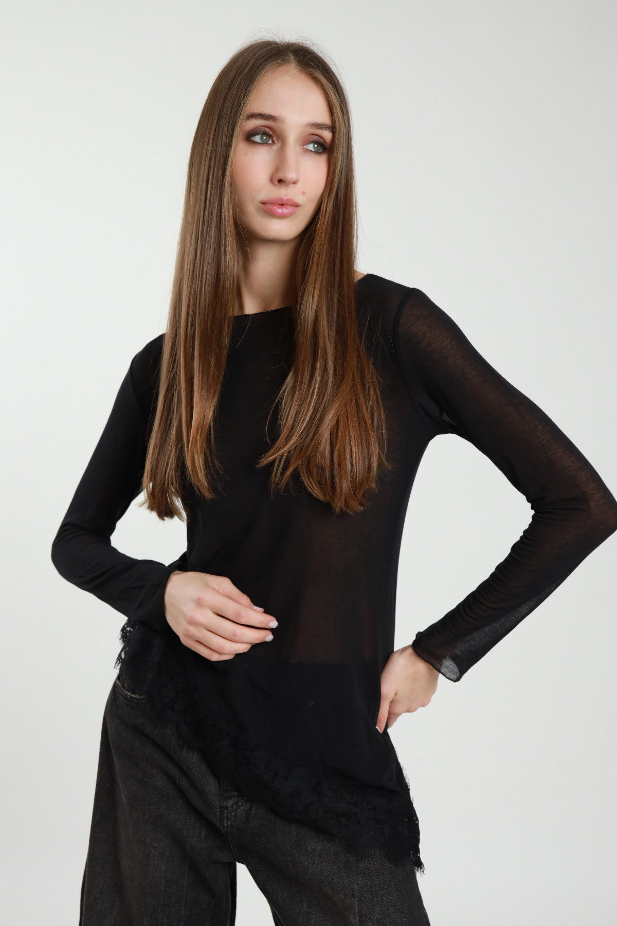 Langärmliges T-Shirt mit U-Boot-Ausschnitt und Spitze am Saum. 80 %vi 9 %pa 6 %ea 5 %ws