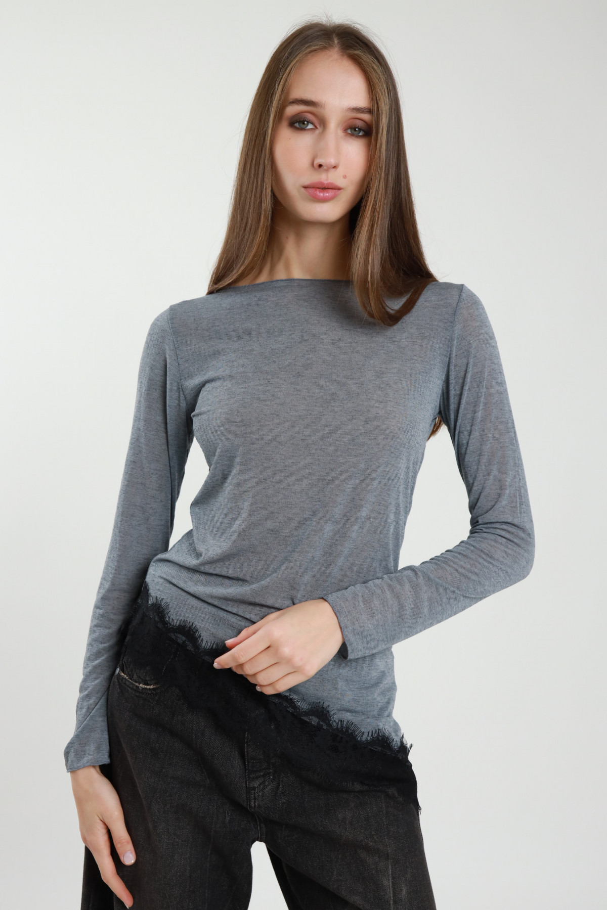 Langärmliges T-Shirt mit U-Boot-Ausschnitt und Spitze am Saum. 80 %vi 9 %pa 6 %ea 5 %ws