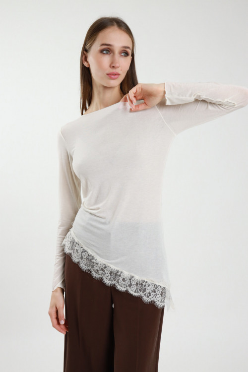 Langärmliges T-Shirt mit U-Boot-Ausschnitt und Spitze am Saum. 80 %vi 9 %pa 6 %ea 5 %ws