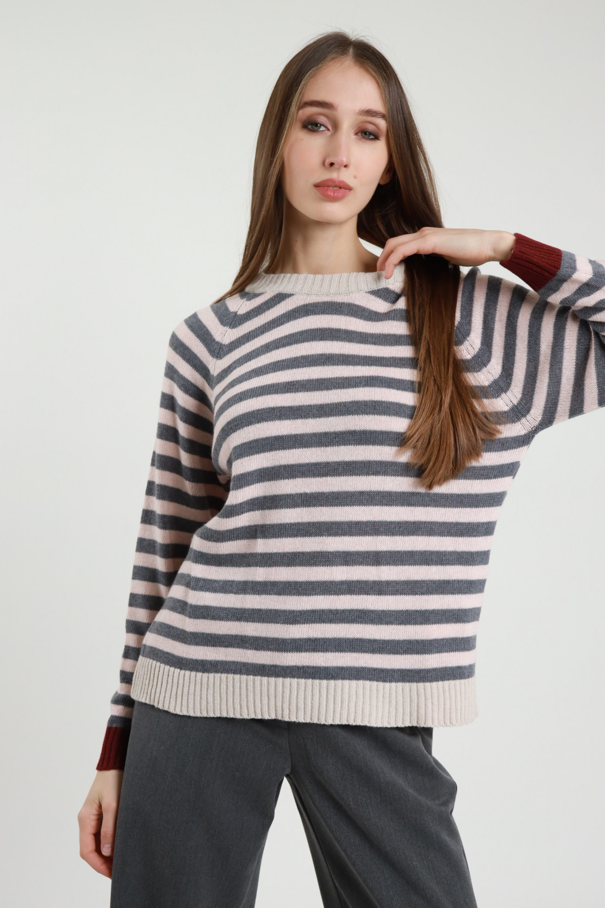 High Neck Pullover with Braids on the Front and Ribbed Hems. 45%ac 29%po 26%ny