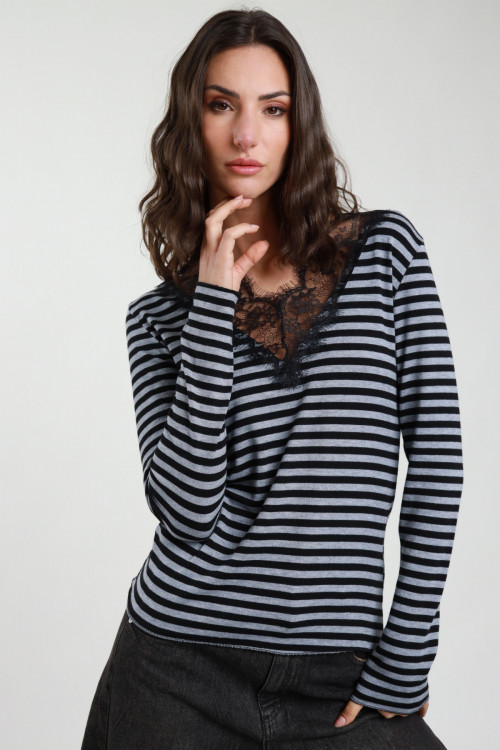 Gestreiftes Langarmshirt mit U-Boot-Ausschnitt und Spitze am Saum. 52 % vi 26 % pl 23 % pa