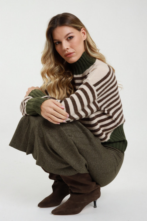Gestreifter Rollkragenpullover mit hohem Kragen und kontrastierenden Kanten. 68 % Stück 12 % Stück 11 % Jahr 6 % Wo 3 % Stück