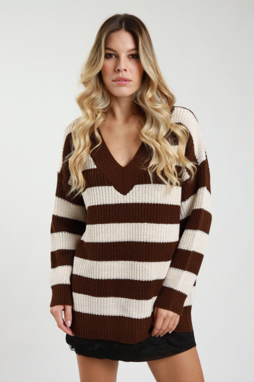 Gestreiftes Strickkleid mit Spitze am Saum und V-Ausschnitt. 100%pa+100%Stk