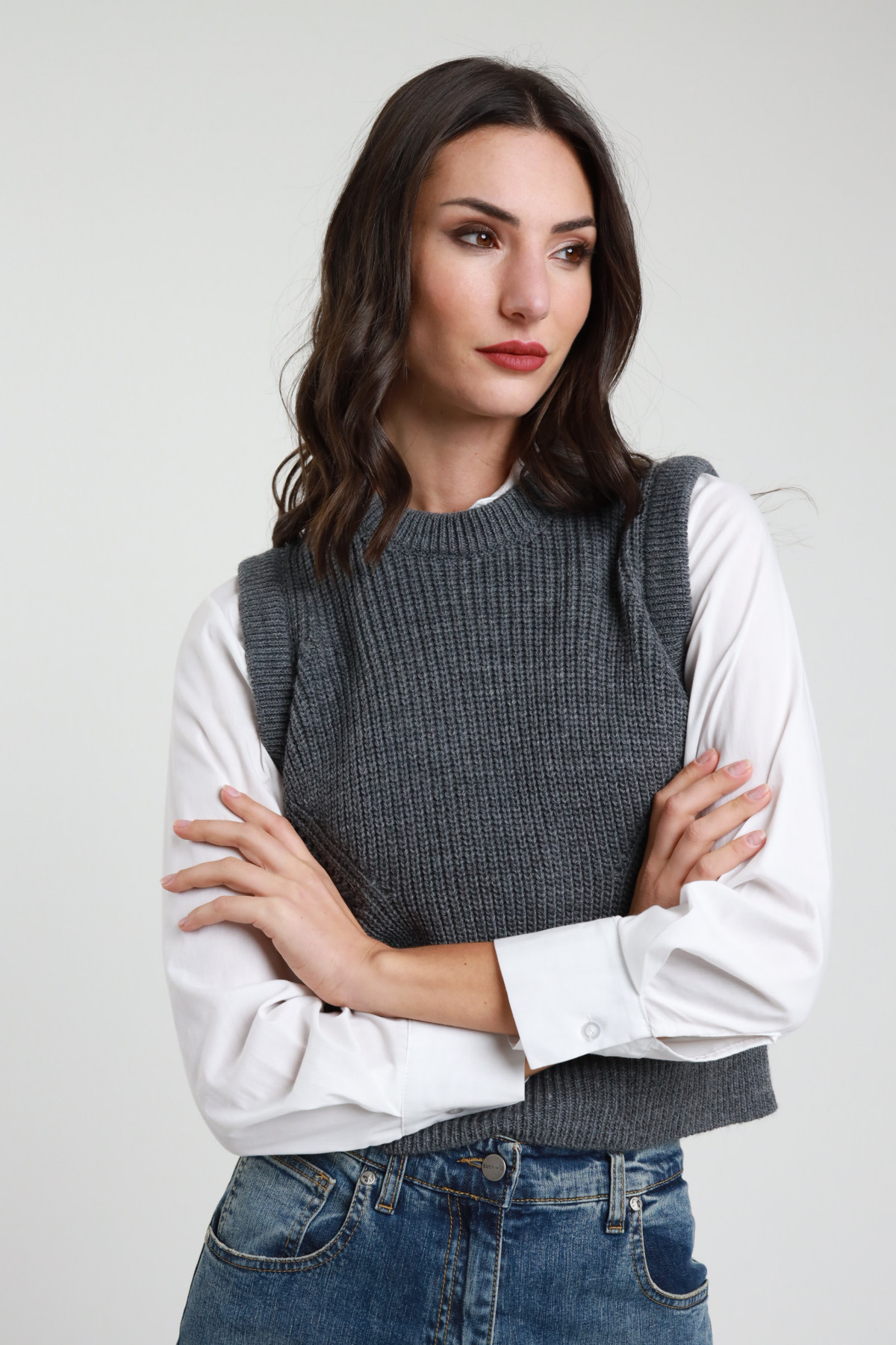 Ärmelloser Rollkragenpullover mit gepolsterten Schultergurten. 50 % vi 27 % pl 23 % pa