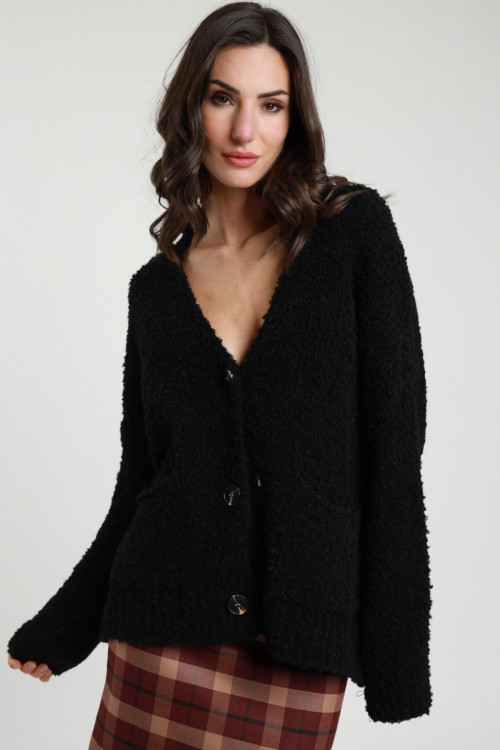 Chunky knit cardigan, with V-neck and three-button closure. Front patch pockets and large ribbed hems. 63%vi 37%ny