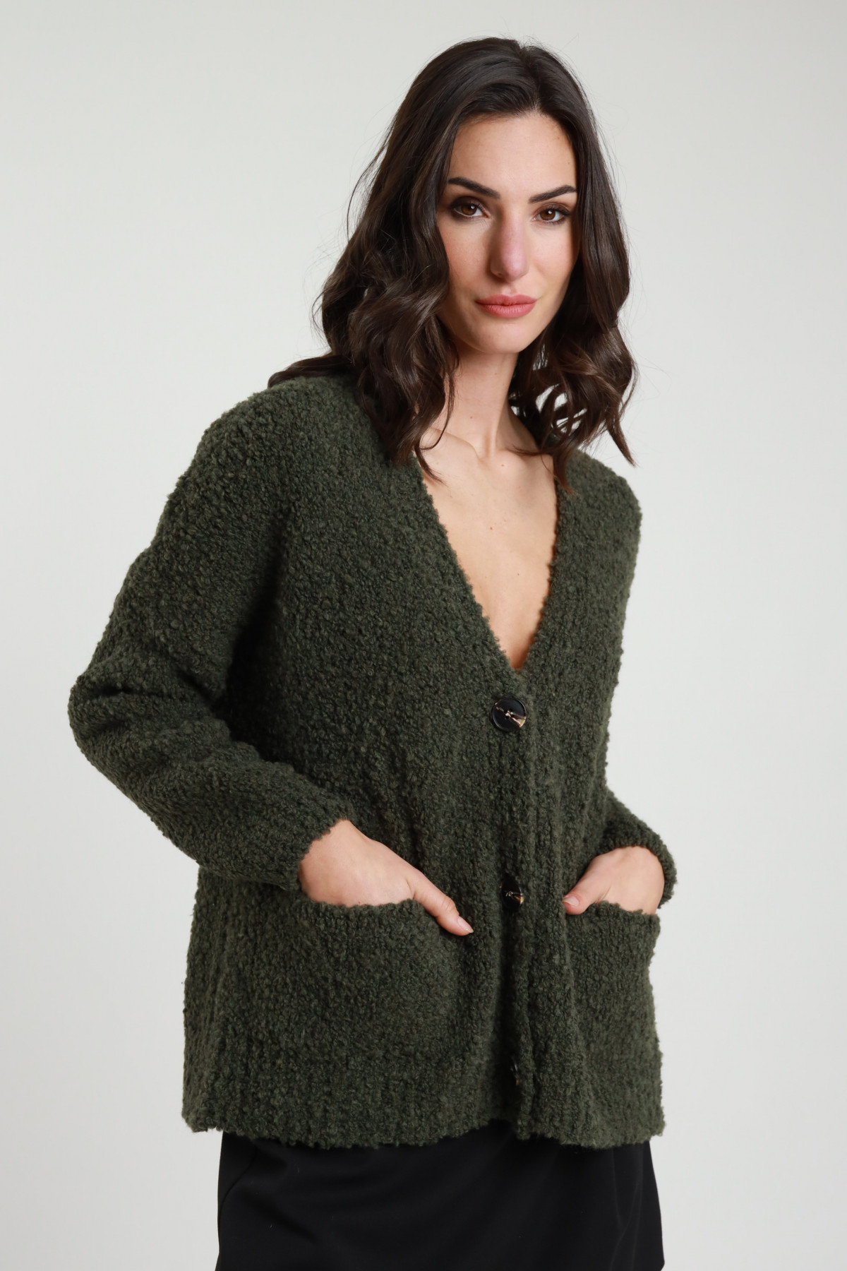 Chunky knit cardigan, with V-neck and three-button closure. Front patch pockets and large ribbed hems. 63%vi 37%ny