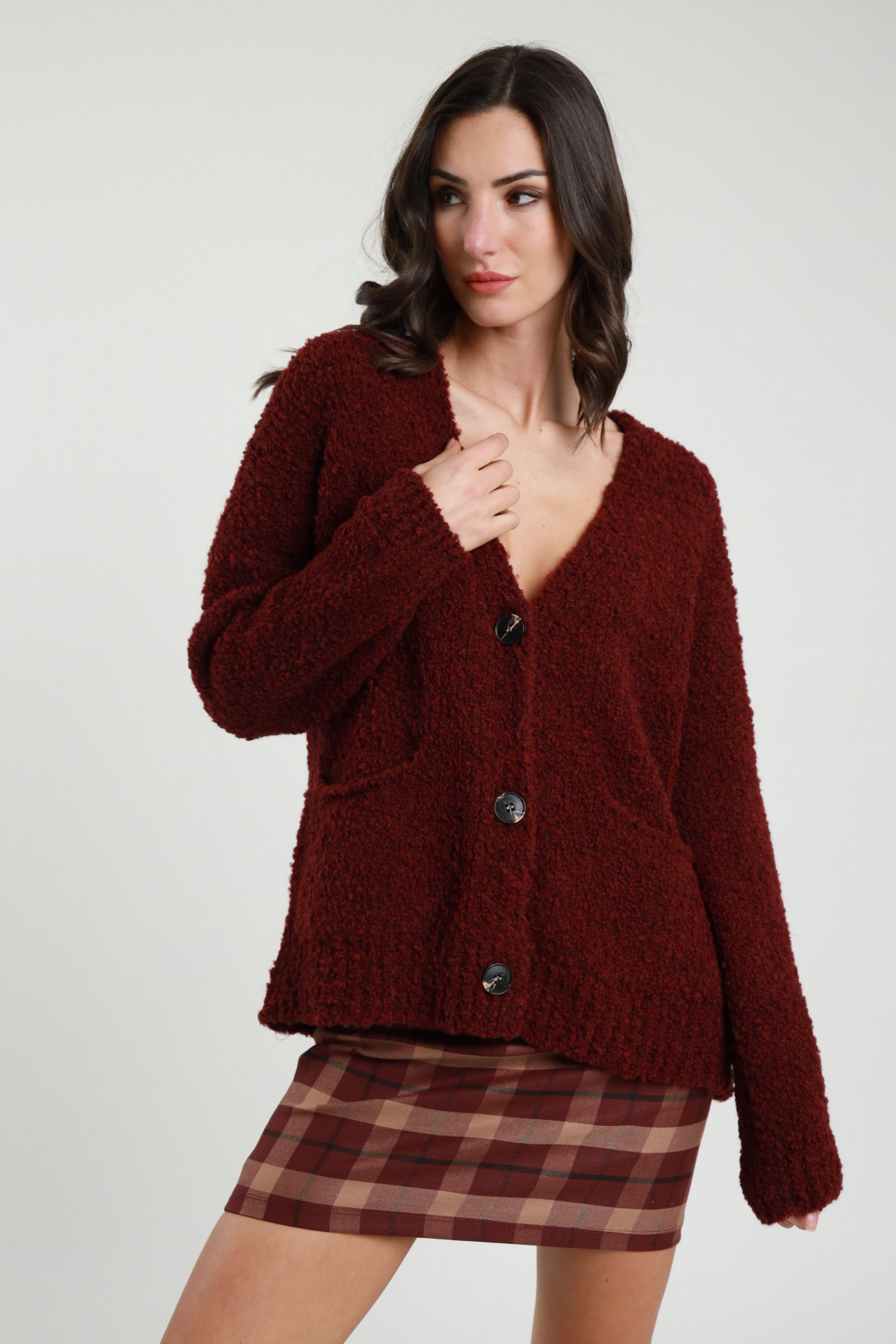 Chunky knit cardigan, with V-neck and three-button closure. Front patch pockets and large ribbed hems. 63%vi 37%ny