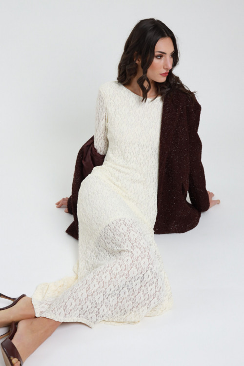 Cibs -Scheidekleid, lange Ärmel, runder Ausschnitt und Longuette -Rock geschnitten. 65%VI 30%NY 5%sp