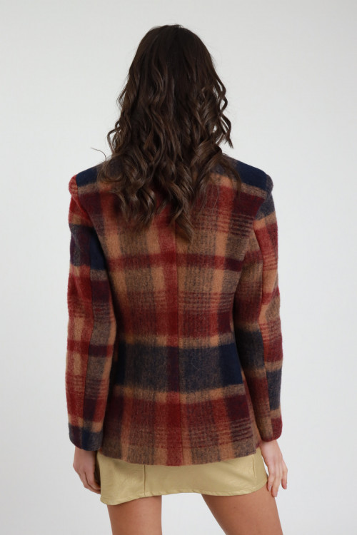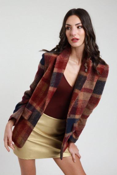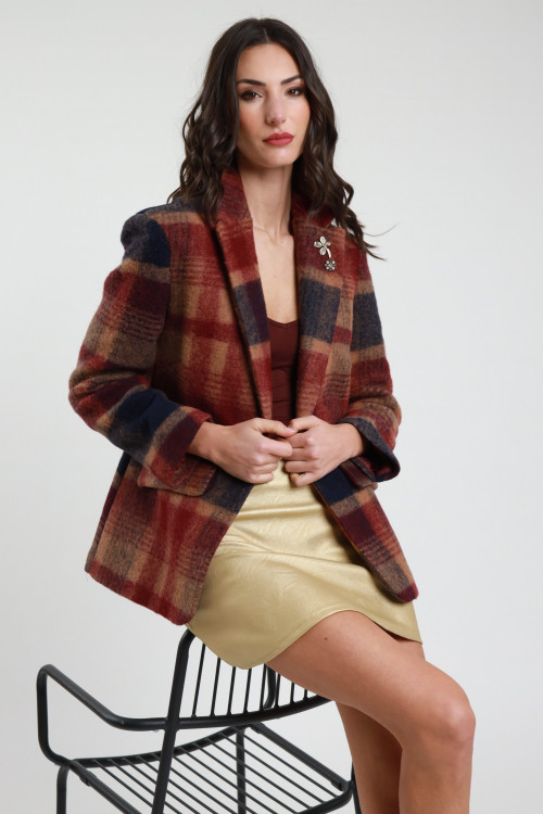 Giacca Oversize in Fantasia Check con Frange in Ecopelle sul Retro e sulle Maniche.