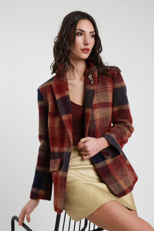 Blazer Doppiopetto in Fantasia Check con Dettagli Tessuto in Lurex, Spilla sul Rever Rimovibile. Tasche Filetto con Pattina.