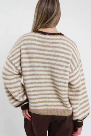 Strickjacke mit koreanisch gestreiftem Ausschnitt mit kontrastierenden Kanten und Puffärmeln. 59%rPet 21%pa 11%pl 8%wo 1%ea