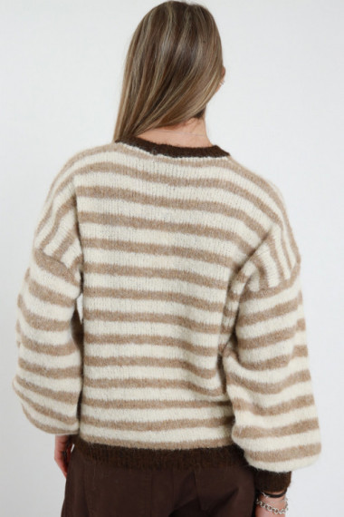 Gestreifter Rundhalspullover mit kontrastierenden Kanten, Oversize-Schnitt mit überschnittenen Schultern und Puffärmeln. 59%rPet 21%pa 11%pl 8%wo 1%ea