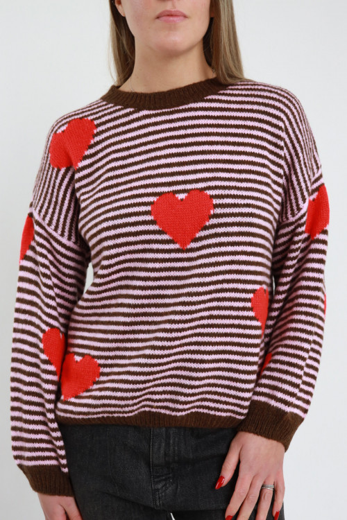 Gestreifter Rundhalspullover mit großen kontrastierenden Herzen. 80 % AC 20 % pa