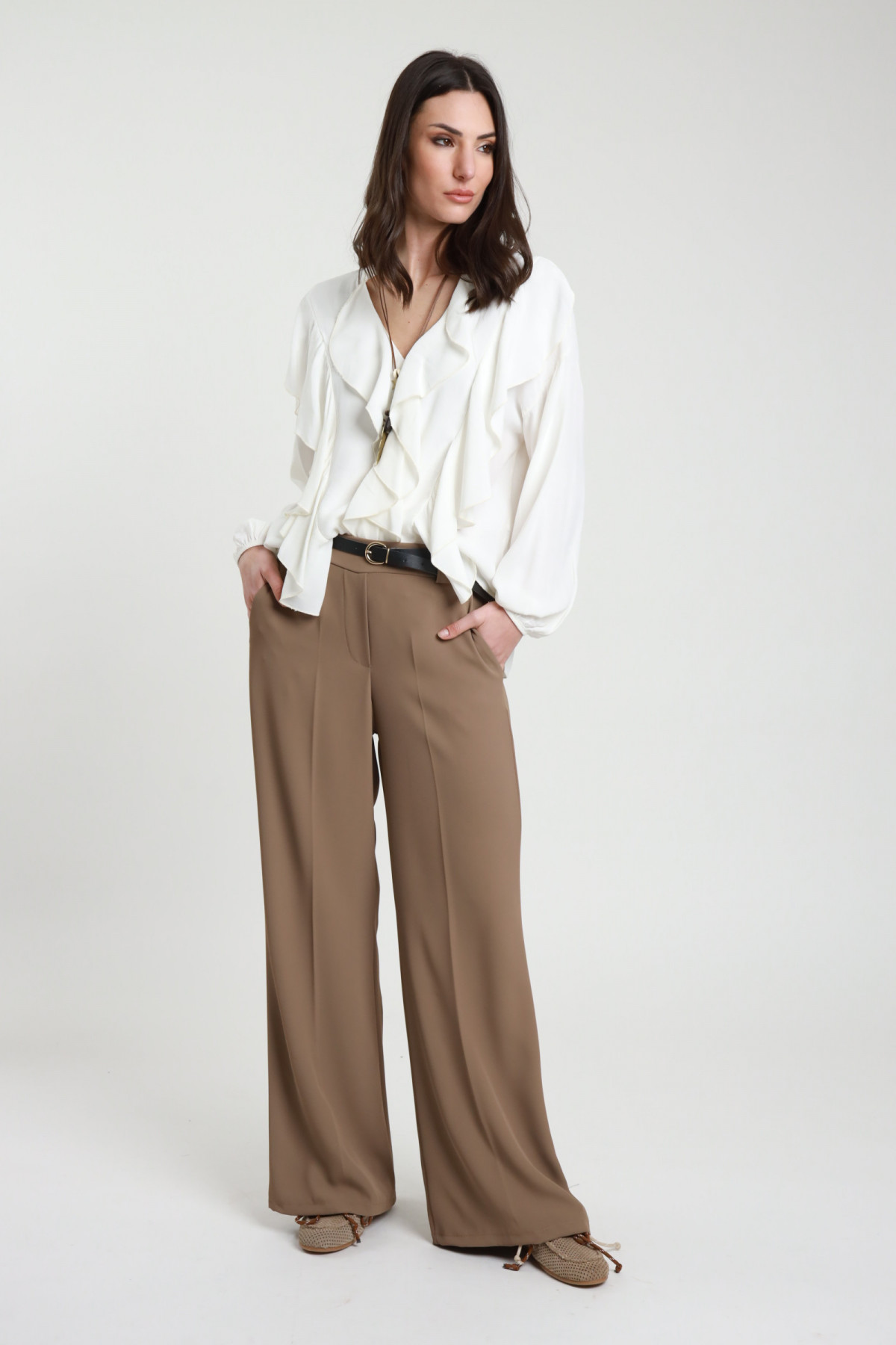 Pantalone Gamba Dritta con Passanti in Vita, Dettaglio Tascone Laterale con Dettaglio Crochet e Strass.