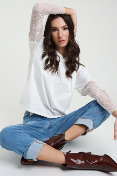 Oversized T-Shirt, with extra sleeve, dropped shoulder, narrow crew neck, striped and with slip fabric with lace attached to the bottom. 50%vi 25%pl 20%co 5%ea