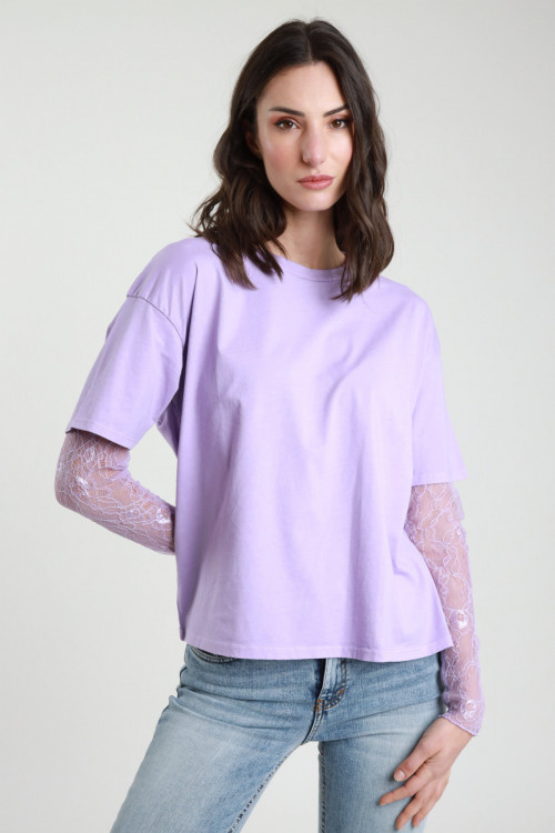 T-Shirt Girocollo Maniche Corte con Stampa sul Fronte + Seconda T-shirt in Pizzo a Maniche Lunghe Rimovibile.