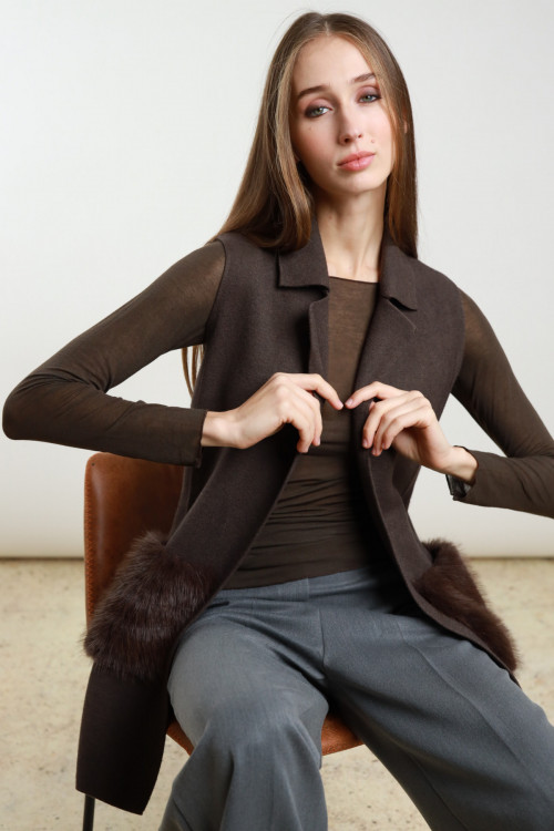 Knitted Vest with Lapel and Eco-Fur Pockets. 50%vi 28%pl 22%ny