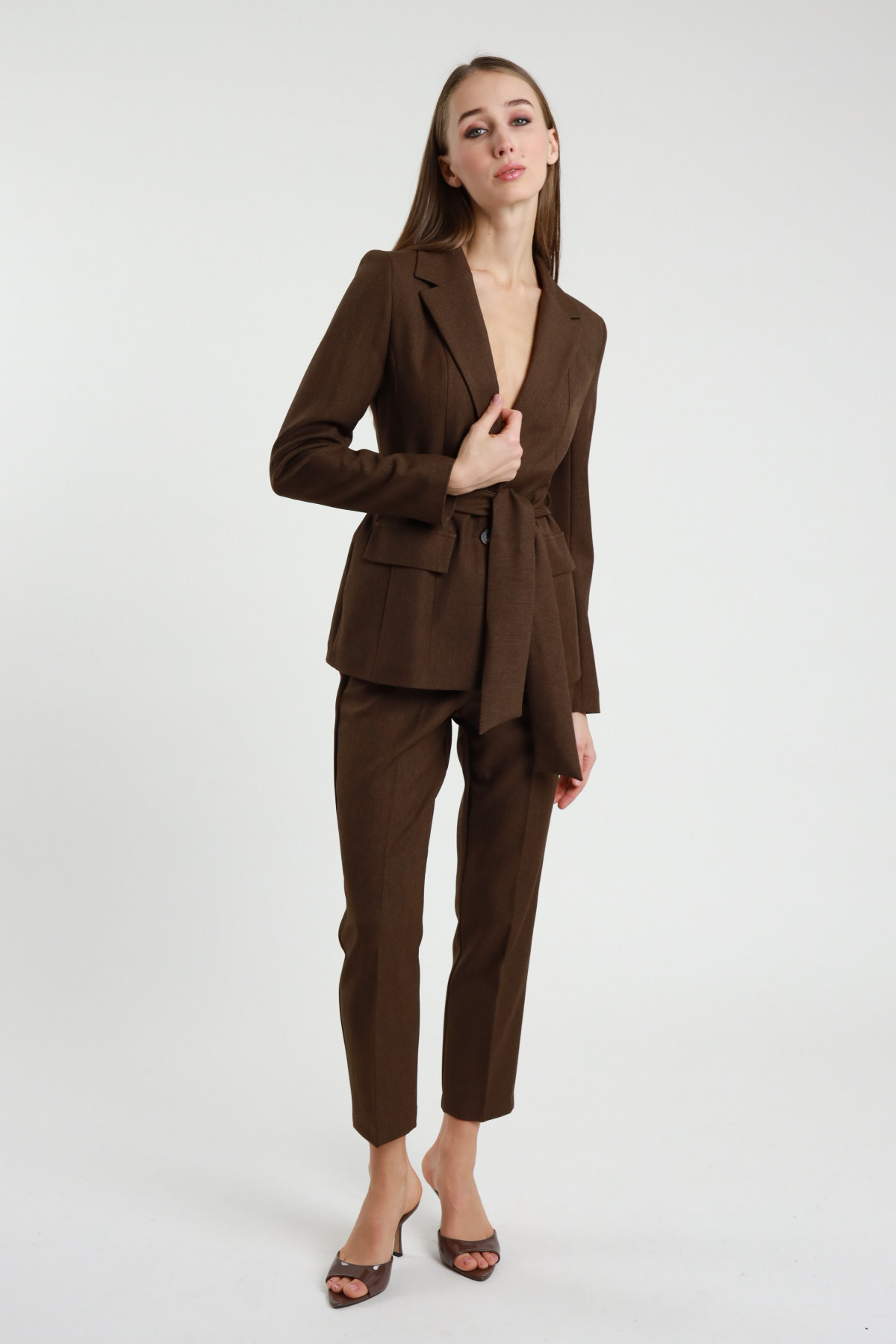 Set consisting of jacket and trousers. Jacket with waist belt, classic lapel, single button closure with front pockets. Slim Trousers with Side Pockets. 100%pl