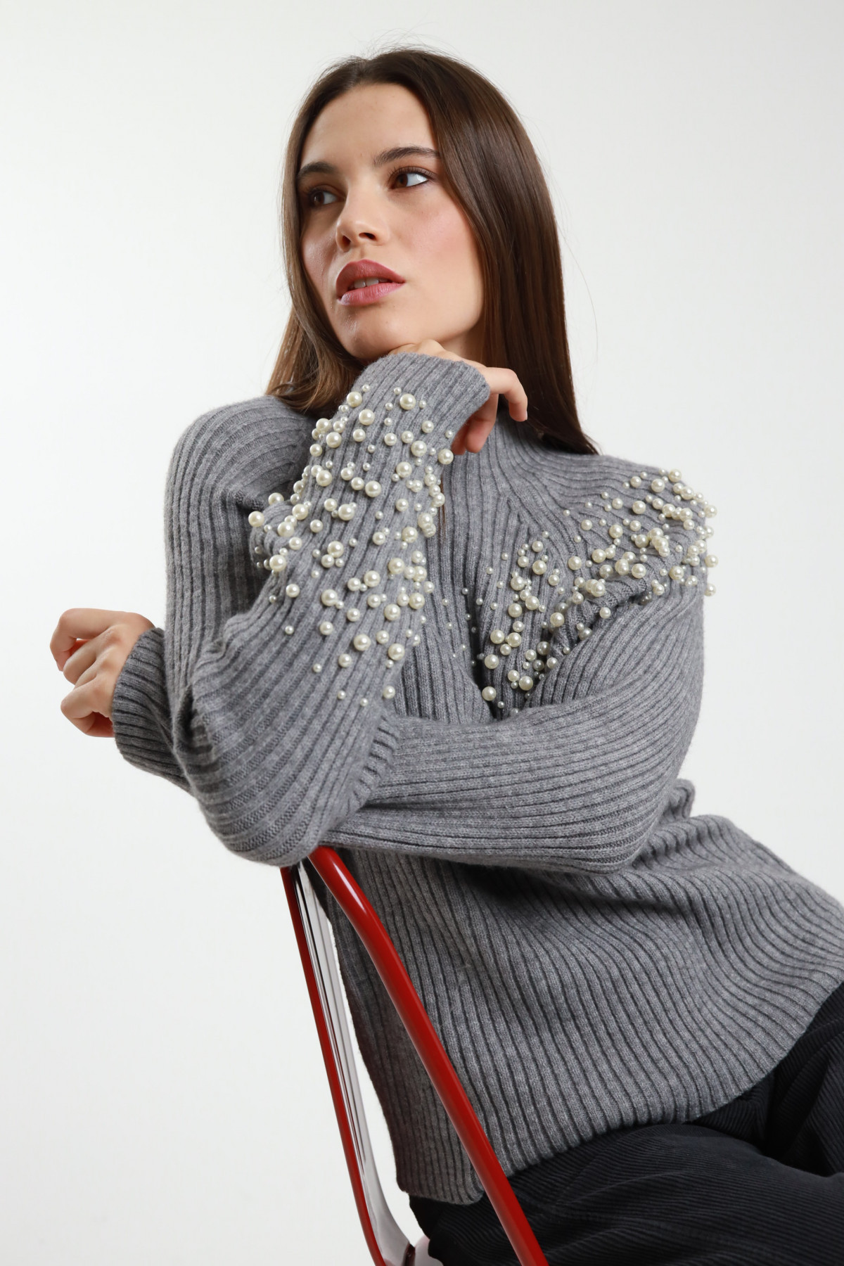 Maglione Girocollo con Dettaglio Paillettes sul Fronte.