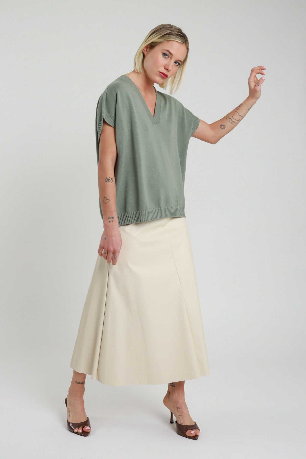 Faux Leather Midi Skirt. Seamless side zip at the waist, soft cut. 100%pu+100%vi