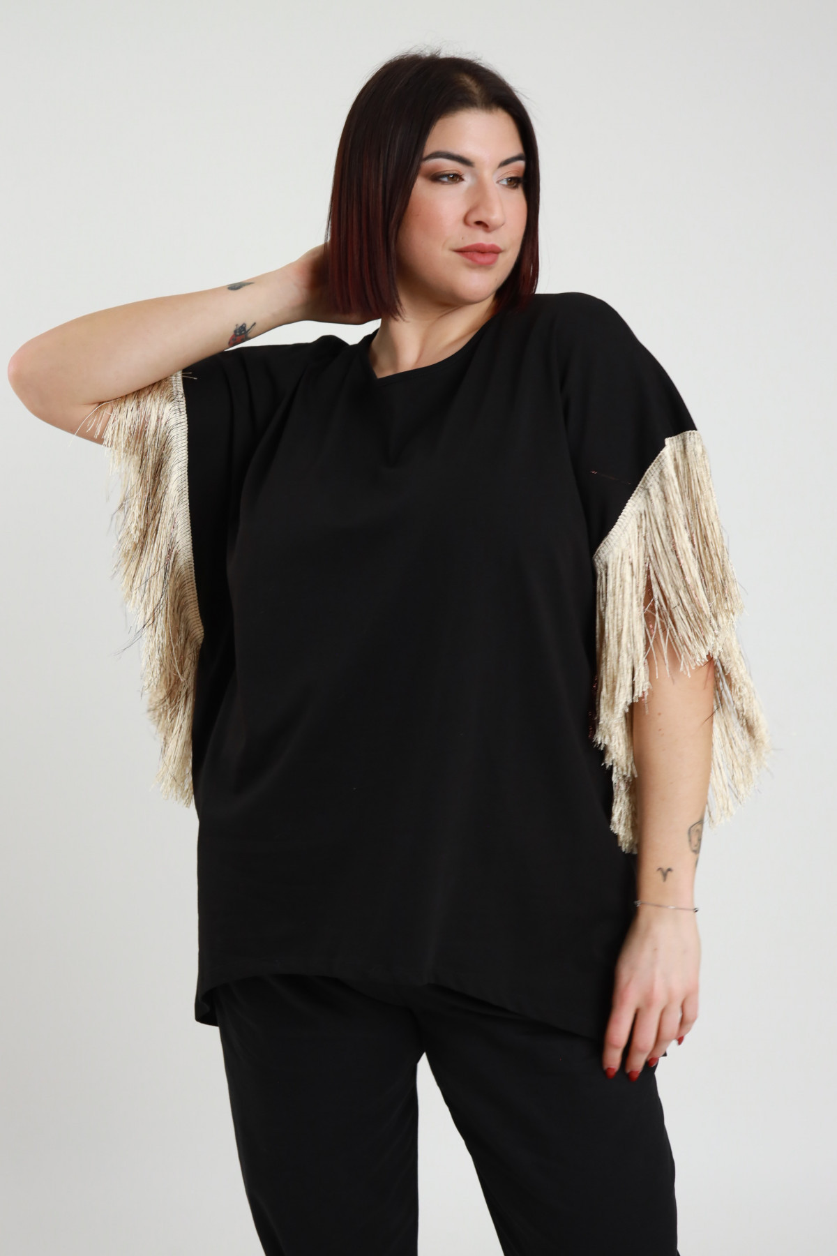 Übergroßes T-Shirt aus Stretch-Baumwolle mit Fransendetails an den Ärmeln – Curvy Susy Star-Linie. 94 % CO 6 % Stück