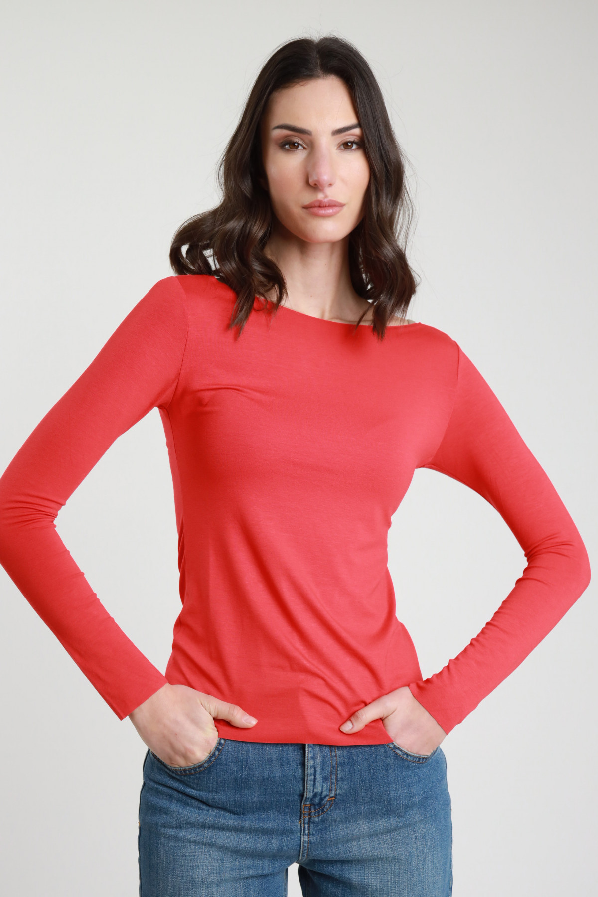 T-shirt Elasticizzata Maniche Lunghe con Scollo V a Righe.