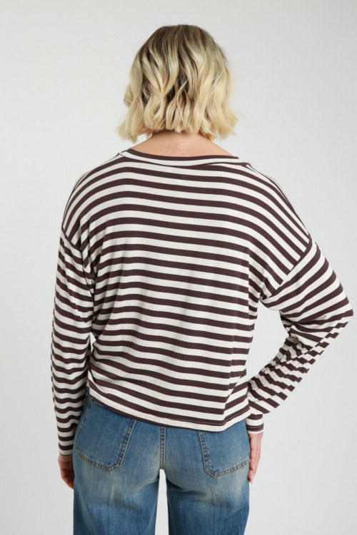 Übergroßes ärmelloses T-Shirt aus Stretch-Viskose mit gepolsterten Schultern und Streifenmuster. 94 %vi 6 %ea