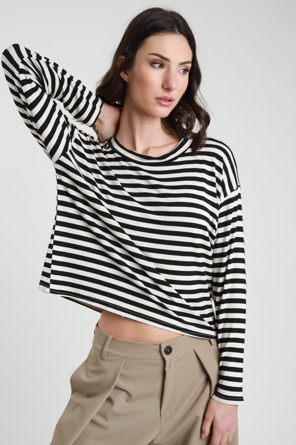 Übergroßes ärmelloses T-Shirt aus Stretch-Viskose mit gepolsterten Schultern und Streifenmuster. 94 %vi 6 %ea