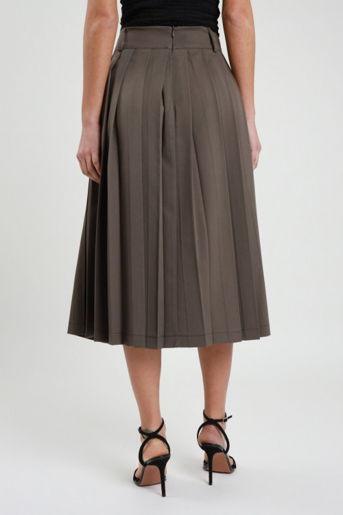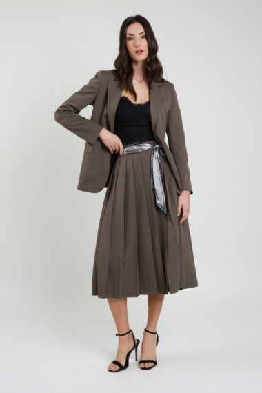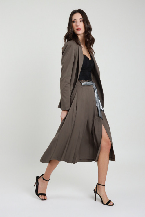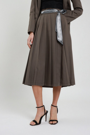 Wide, high-waisted midi skirt, with side slit, zip on the back and belt loops at the waist. Scarf Attached. 78%pl 18%vi 4%ea