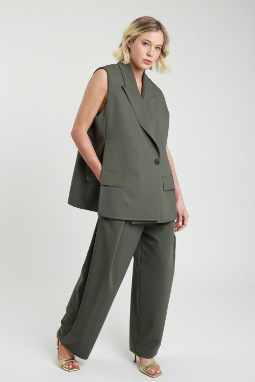 Completo a Pois composto da Gilet Over Monopetto + Pantaloni a Palazzo con Elastico sul Retro e Tasche Laterali.