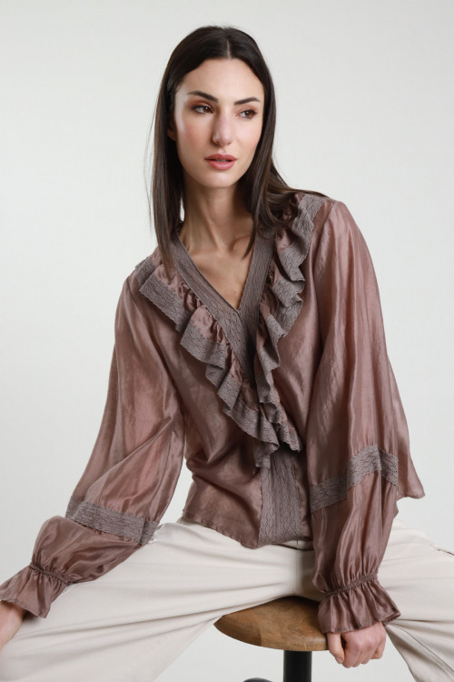 V-neck blouse with reds and lace on the front, puffed sleeves with elastic on the cuffs. 85%ly 15%pl