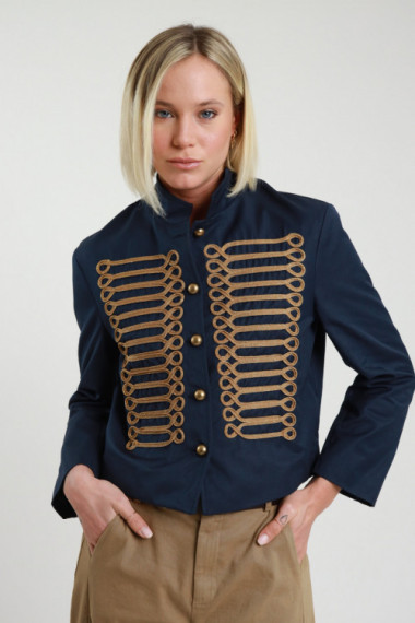 Crop Jacket with Collar and Gold Circus Style Embroidery, Gold Button Closure. 57%co 34%pl 9%pa+100%pl