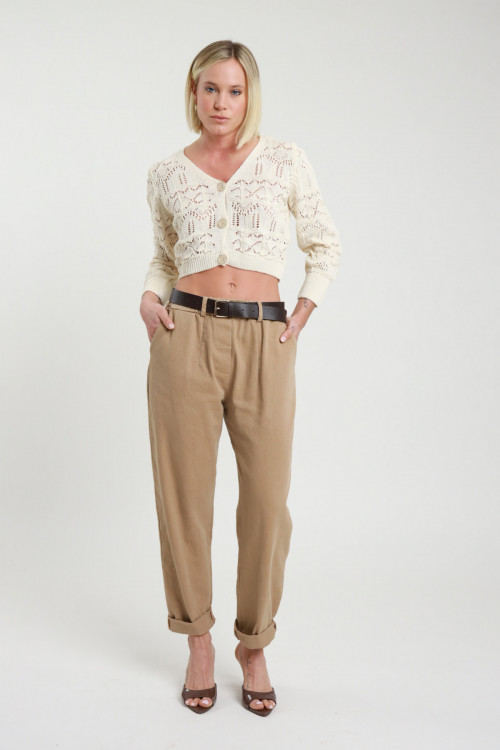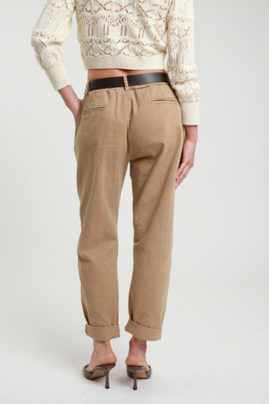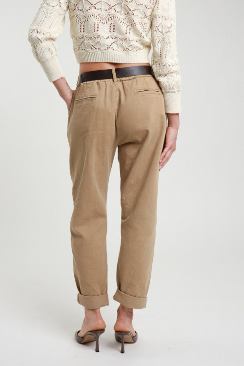 Banana trousers with large pockets, zip and button closure and waist belt. 100%co