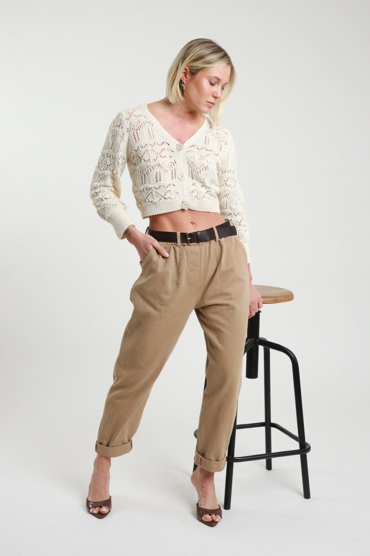 Crop Cardigan in Perforated Cotton Knit, 3 Button Closure. 50%co 50%ac